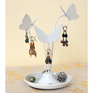 The mini Meadow jewelry the stand by position Umbra displays and organizes small jewelry items such as earrings, bracelets, and rings. Constructed of white powder-coated steel, three hooks hold bracelets and rings while the mesh butterfly wings store earrings. The base doubles as storage tray. Measures 7 inches tall by 5 inches in diameter. Designed by Alan Wisniewski for Umbra - a worldwide leader in casual, contemporary and affordable design for that home.